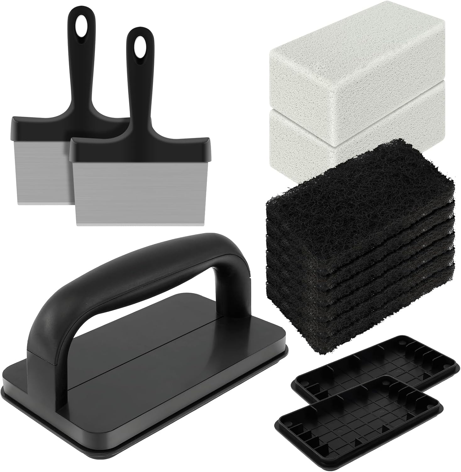 Parts List:8×Scouring Pads2×Griddle Scraper2×Pumice Stone1×Handle2×Accessories Product Specification:Description:Do you annoy that is difficult to clean griddle or barbecue grill? This griddle cleaning kit is a choice for you. With griddle cleaning kit, handle and scouring pads make cleaning a breeze. Key FeatureDeep Clean: The griddle scouring pads help you quickly and deeply remove debris, tough stains and other baking residue. Portable: Come with a handle that is easy to install with the griddle scouring pads. Portable and lightweight, making it convenient to use. SpecificationName: Griddle Cleaning KitMaterial: Plastic, Stainless Steel, Ceramic StoneColour: BlackGriddle Scraper: 22×16.5cmPumice Stone: 11.5×6×5cmScouring Pads: 14.5×8×1.5cm Note:1.There may be slight differences between the picture and the actual color of the commodity. We will try our best to show you the exact color2.Please allow slight dimension difference due to manual measurement.