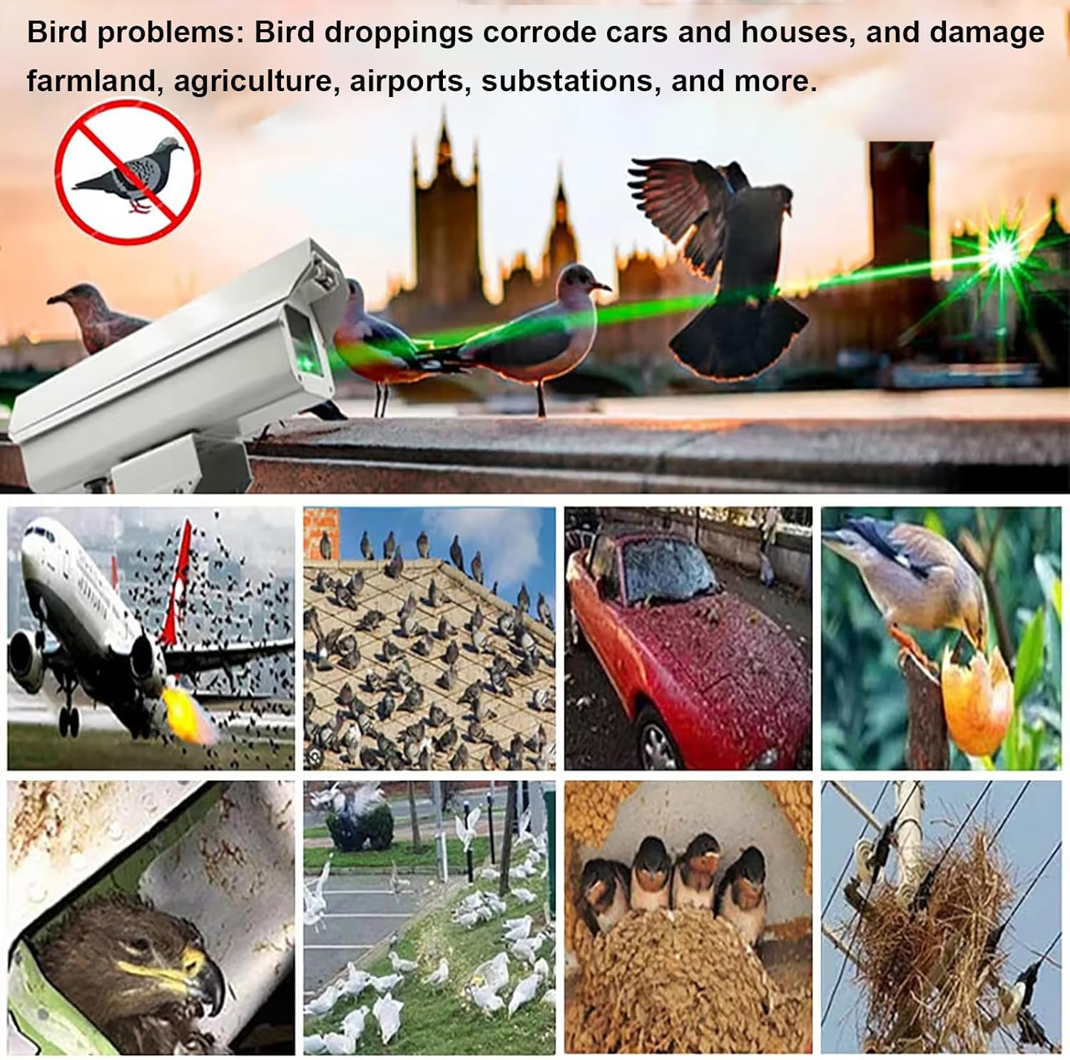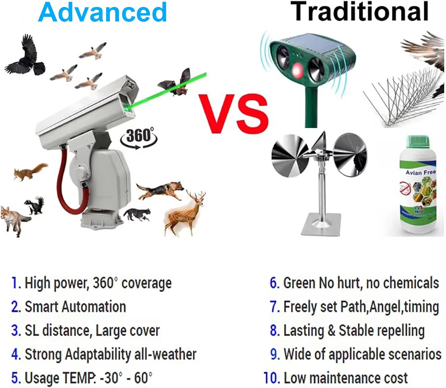 Protect your valuable property from bird intrusions with our 360° Rotating Smart Laser Bird Repellent. This state - of - the - art device is designed to offer unparalleled protection in a variety of settings. ♦The 360° rotating pan/tilt mechanism is the highlight of this bird repellent. It constantly scans the surrounding area, ensuring that no bird can approach unnoticed. ♦The green laser technology startles birds by interfering with their visual and nervous systems, making them leave the area quickly. ♦Thanks to the smart APP control, you have full control over the device. Customize the working hours to fit your schedule or the peak bird activity times. ♦Built with an IP66 waterproof and dustproof rating, our bird repellent is suitable for outdoor use in any weather. ♦Bird scare devices Ideal for orchards, farms, warehouses, power stations, airports, and other areas needing bird/animal control, protecting crops, equipment, and public safety. Product Specifications Case Material: Aluminum Alloy Operating Voltage: 12V DC Power consumption: 24W Control Method: Smart App Control Pan rotation range: 0°-360° continuous rotation Tilt rotation range: Factory default: 20°-85° Pan rotation speed: 0.1°-9°/s variable speed Tilt rotation speed: 0.1°-5°/s variable speed Presets: 80 can be set and recalled Preset cruise control: Supports 1 group Power-on self-test: Automatic self-test upon power-up Power-on auto-cruise (STM32 version): Supports auto-cruise control Laser source: 525nm 1W green light source Laser icon: Line (A) / Full star (B) Operating temperature: -30°C to 60°C IP rating: IP65 Delivery Items 1* Automatic bird repeller 1 * Accessories (3-meter power cord, 12V/2A adapter, data cable included)