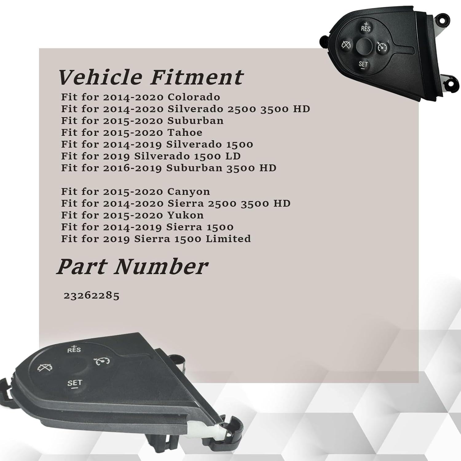 Product specifications: Condition: brand new Compatibility: Fit for 2014-2020 Colorado Fit for 2014-2020 Silverado 2500 3500 HD Fit for 2015-2020 Suburban Fit for 2015-2020 Tahoe Fit for 2014-2019 Silverado 1500 Fit for 2019 Silverado 1500 LD Fit for 2016-2019 Suburban 3500 HD Fit for 2015-2020 Canyon Fit for 2014-2020 Sierra 2500 3500 HD Fit for 2015-2020 Yukon Fit for 2014-2019 Sierra 1500 Fit for 2019 Sierra 1500 Limited Replace OE Number: 23262285 Package: 1× Steering Wheel Cruise Control Switch