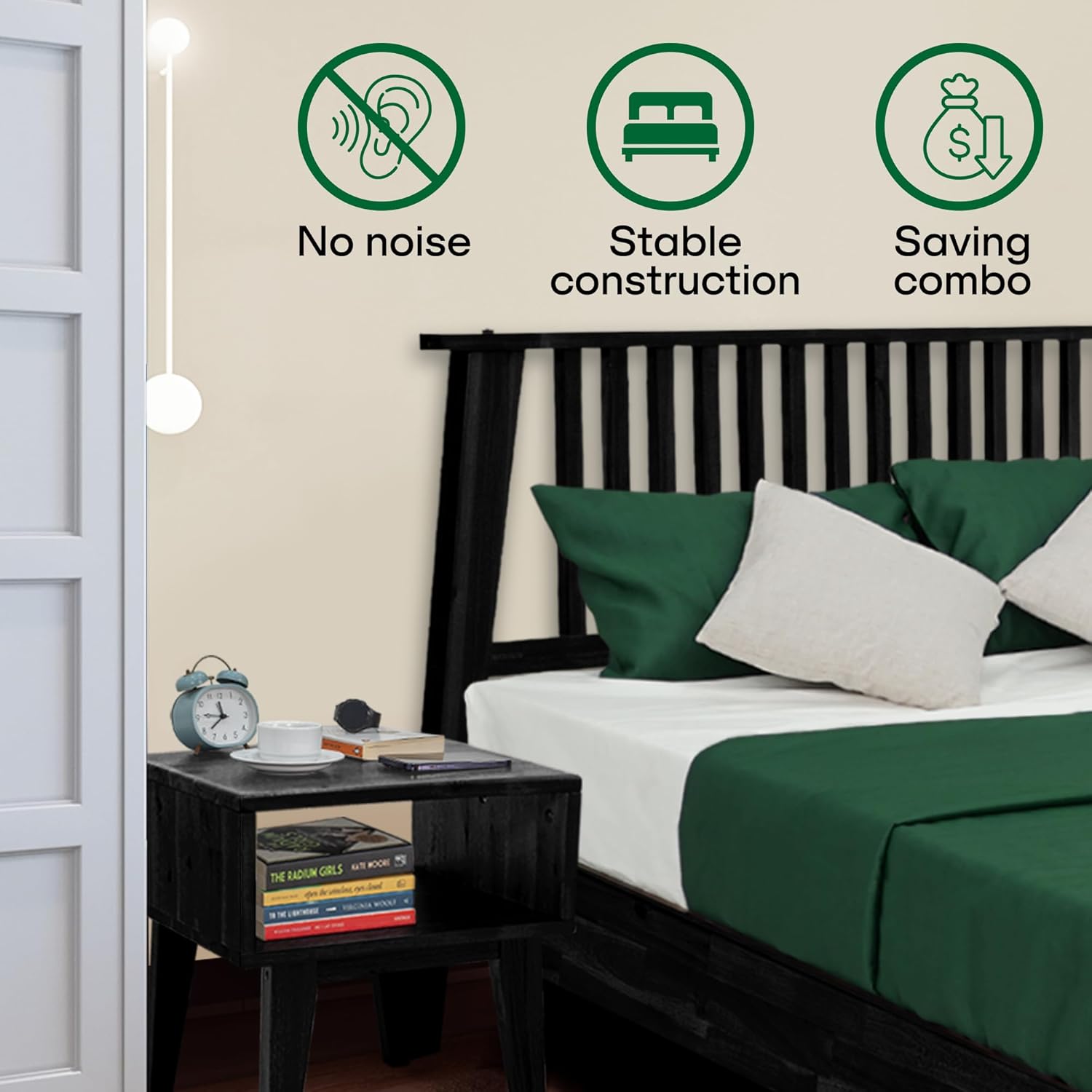 | Storage Options | Under-bed storage, Nightstand drawer and shelf |
