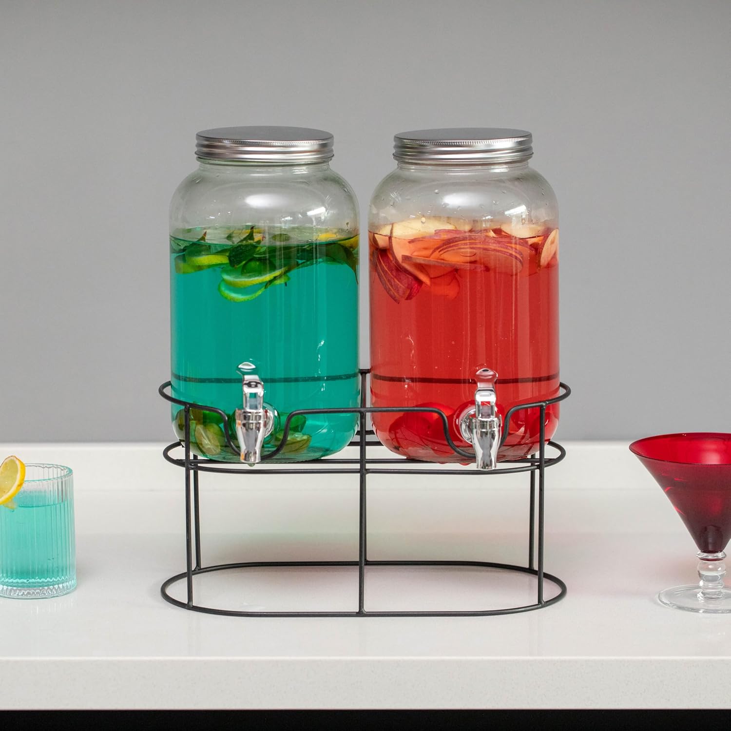 Elevate your hosting experience with this set of two 3-liters versatile fruit juice glass containers, beautifully displayed side by side on a single metal stand for added convenience and style. Ideal for showcasing two different drinks at once, these beverage dispensers make it easy to serve everything from fruit juices and iced tea to classic cocktails at any event. Featuring sturdy glass containers with lids and a shared metal stand, they bring functionality and elegance to your drink table, countertop, or bar setup. Perfect for lemonade dispensers or as part of your bar cart accessories, they seamlessly transition from kitchen staples to bartender tools, catering to various needs. Designed for versatility, these beverage dispensers aren’t limited to just serving drinks. They’re also excellent as liquid laundry detergent containers or laundry soap dispensers, making them a practical solution for both your kitchen and laundry room. Whether you’re setting up a chic laundry station or adding flair to a drink table, this set complements any space with ease and sophistication. For those looking to create a memorable indoor or outdoor event, these side-by-side beverage dispensers are ideal for everything from a birthday bash, engagement party, or poolside party to a sophisticated wedding or festive Halloween get-together. Use them as elegant housewarming party decorations, reunion essentials, or as eye-catching hosting accessories for your laundry or kitchen countertop. This multifunctional set is also a thoughtful gift idea for wives, mothers, and any party enthusiast looking to elevate their home and hosting essentials. With its timeless appeal and wide range of uses, it’s a must-have for anyone who loves to entertain and keep things beautifully organized, providing a stylish and practical solution for serving drinks, enhancing your laundry decor, or adding a charming touch to bar setups.