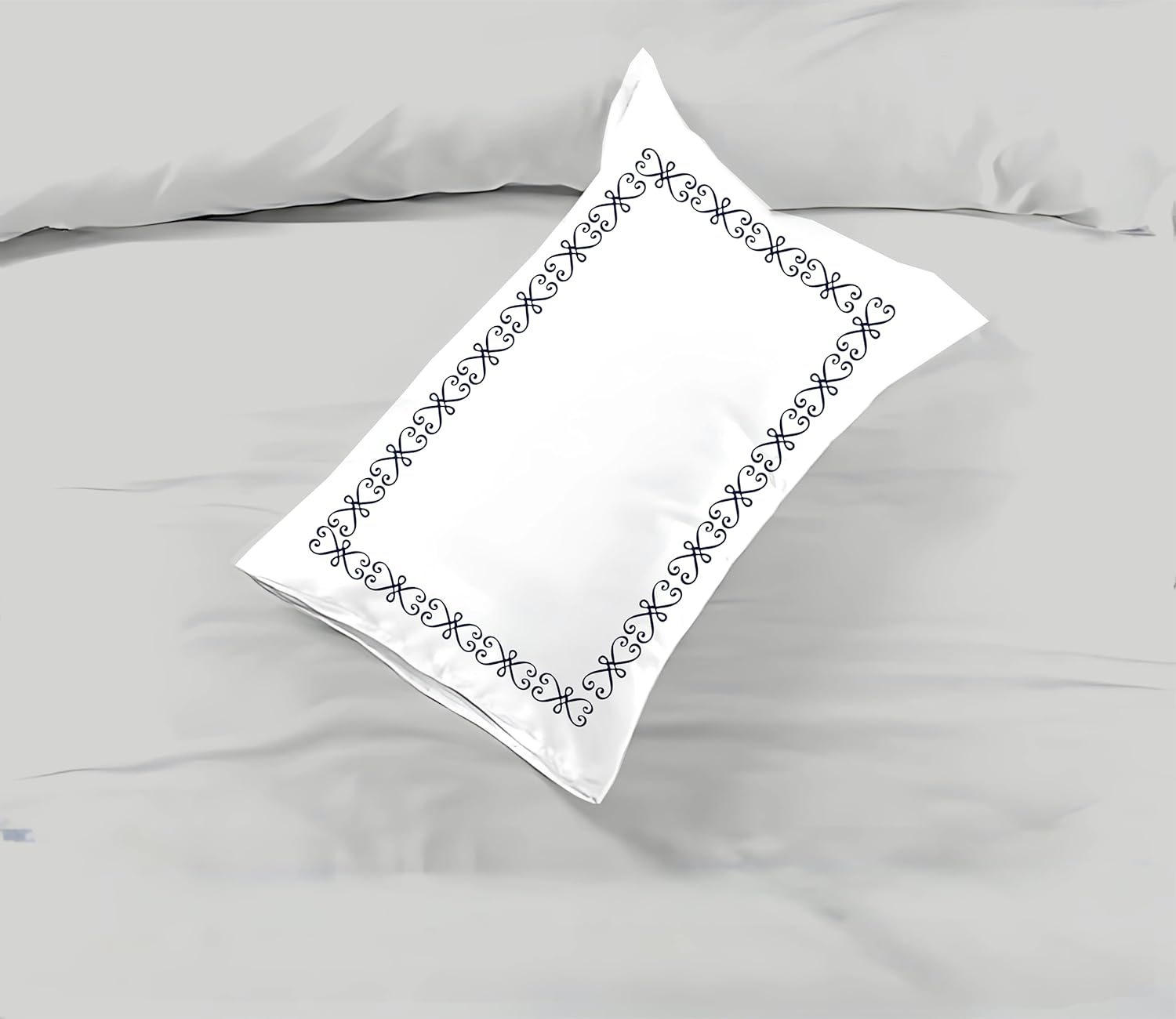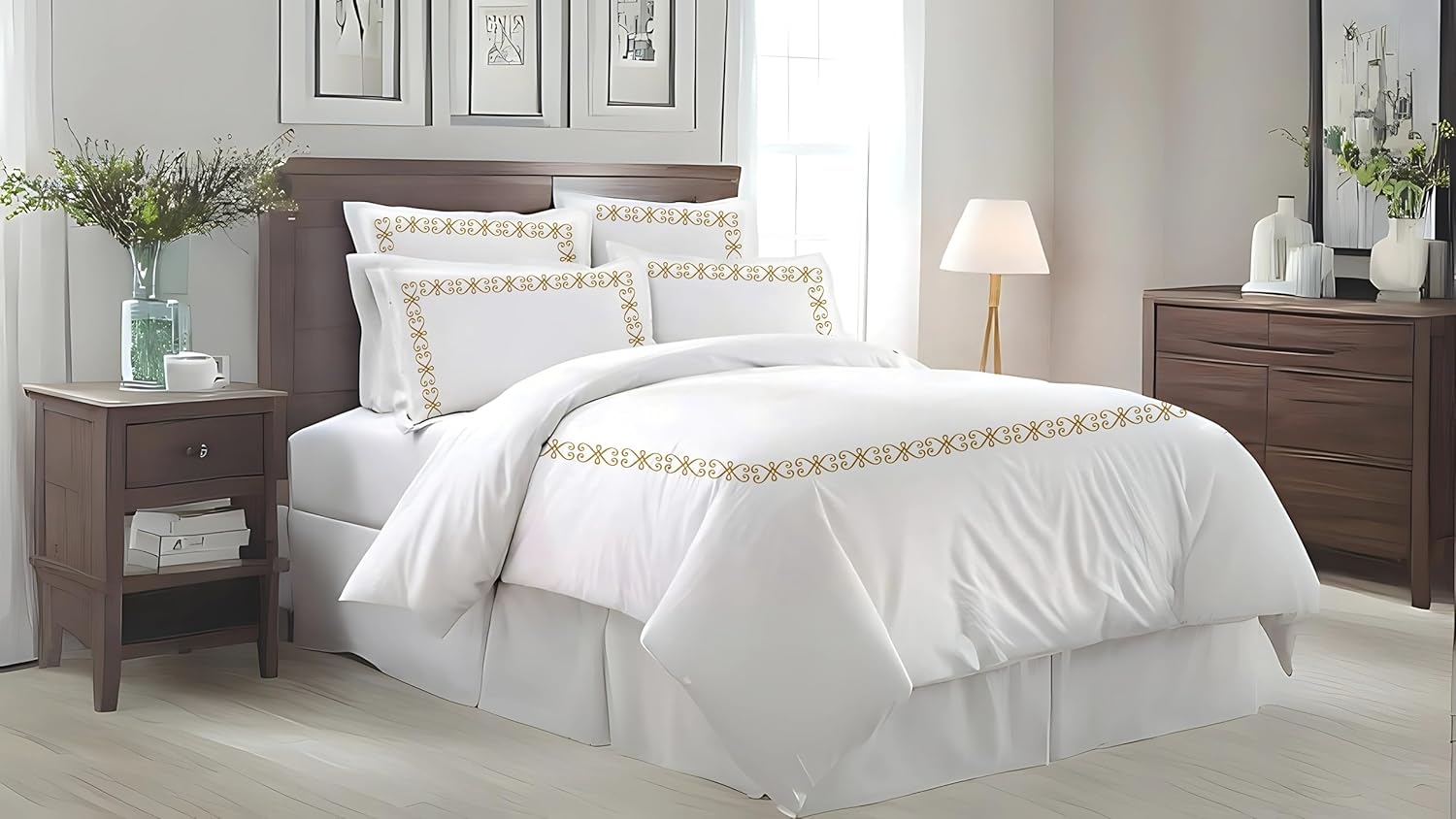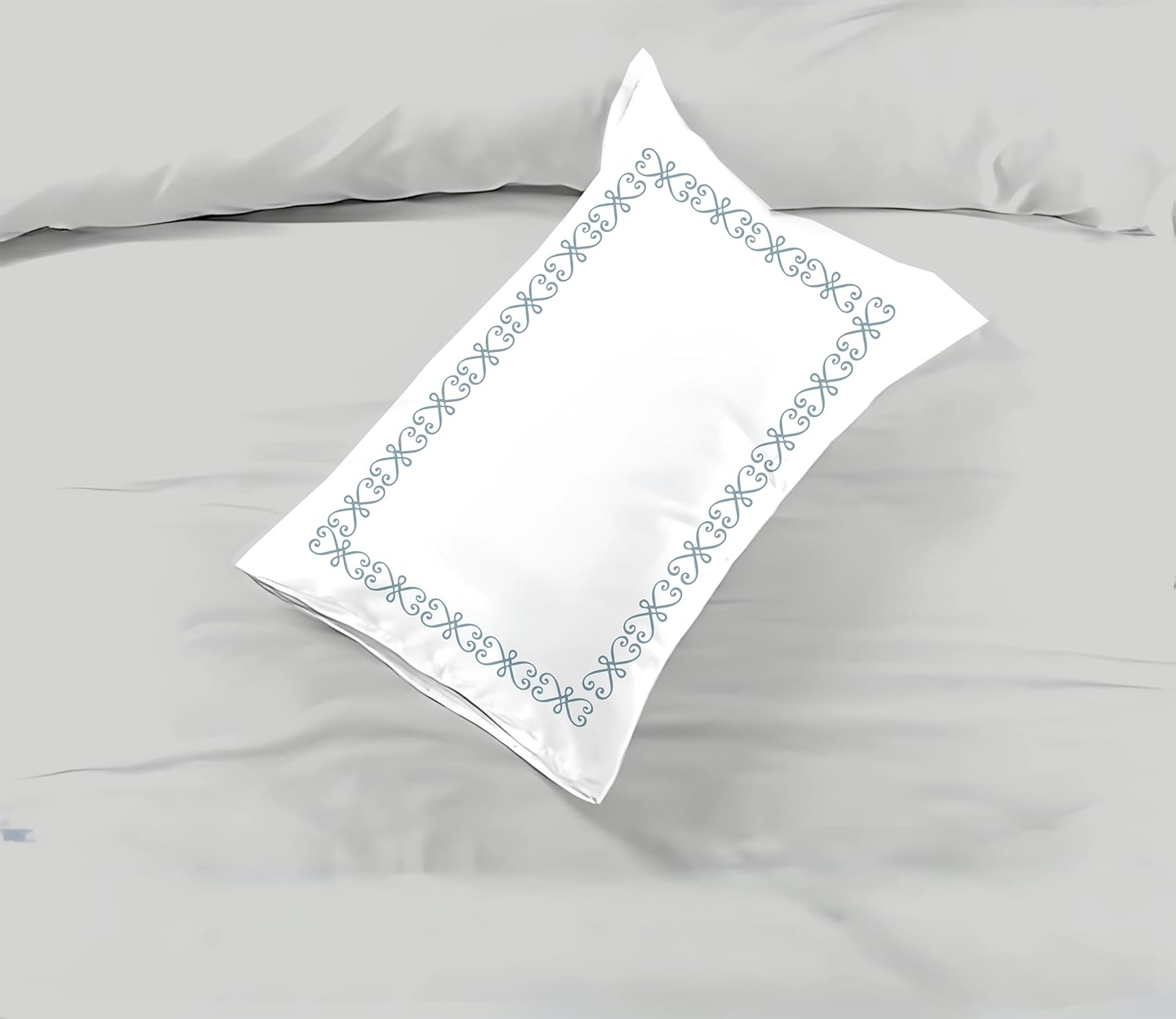 Transform your bedroom into a sanctuary of luxury with this exquisite 3-piece duvet cover set. Crafted from premium 100% Egyptian cotton with a lavish 400 thread count, this bedding set offers an exceptional blend of softness and durability. The pristine white duvet cover and matching pillowcases are elegantly adorned with a sophisticated Greek key embroidery pattern in teal, adding a touch of timeless sophistication to your space. The high-quality cotton construction ensures breathability and comfort throughout the seasons, while the meticulous attention to detail in the embroidery work showcases superior craftsmanship. This BedDecor set combines classic design elements with modern comfort, making it a perfect choice for master bedrooms, guest rooms, or any space where you want to create an atmosphere of refined elegance. The crisp white background serves as a versatile canvas that effortlessly complements any room decor, while the intricate embroidery adds a distinctive decorative element that elevates the entire room's aesthetic.