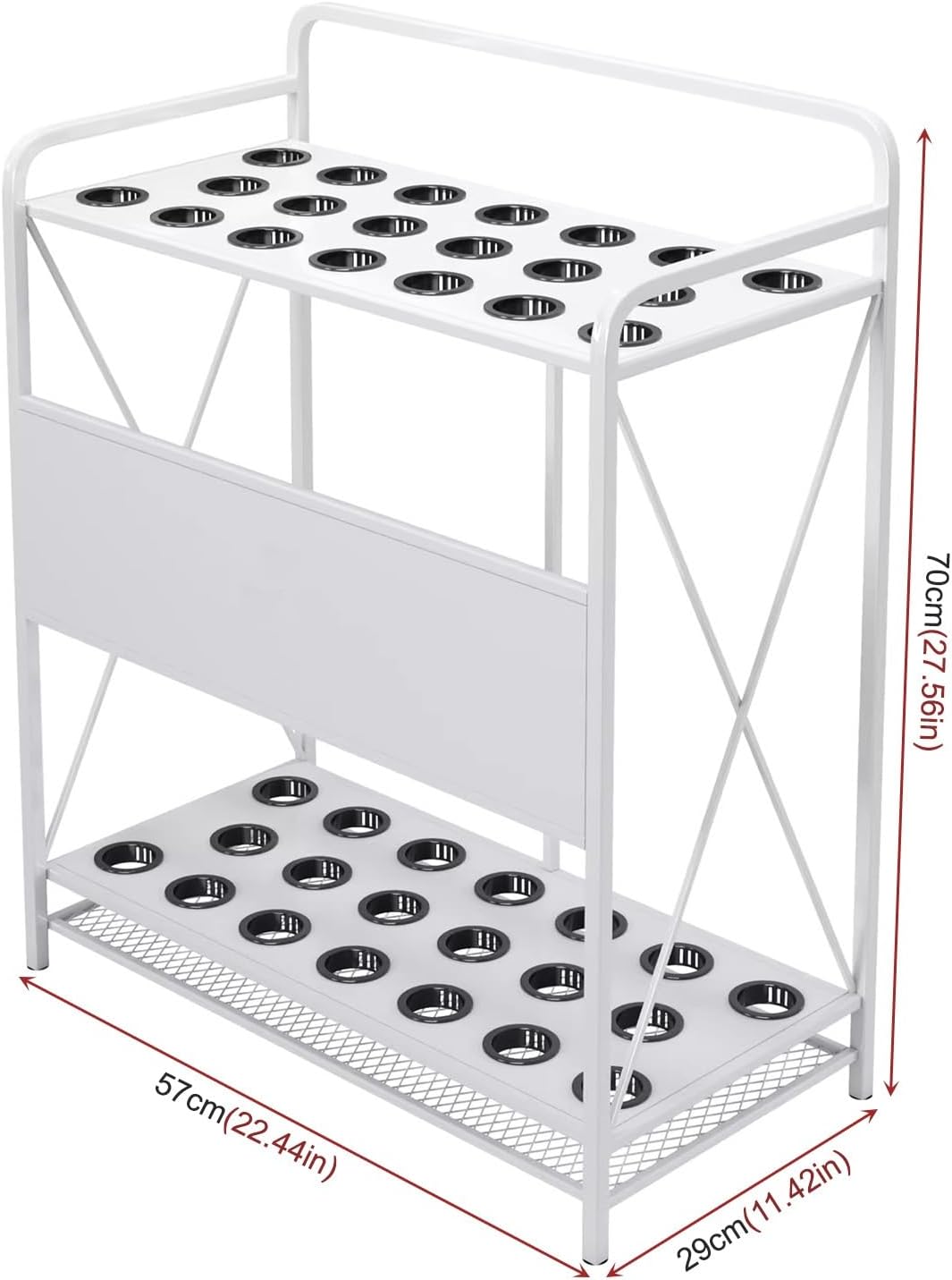Introducing our Floor Standing Pool Cue Rack, the ultimate solution for organizing your billiard essentials while enhancing the aesthetic of your game room. This stylish and functional storage solution allows you to neatly store all your pool cues, saving valuable space and keeping your area tidy. Designed with both practicality and elegance in mind, it fits seamlessly into billiard rooms, game rooms, clubs, and other entertainment spaces. Crafted from durable iron, our cue rack boasts a robust construction that ensures longevity and stability. With dimensions of 40x20x70cm and 57x29x70cm, it offers ample storage capacity, making it perfect for gatherings, parties, or daily use. The cleverly designed holes with a diameter of 3.5cm accommodate most standard cues, allowing for easy access and organization. Whether you're a casual player or a serious billiards enthusiast, our pool stick holder enhances your experience by keeping your cues within reach and showcasing them stylishly. Maintenance is a breeze; simply wipe it down with a cloth to keep it looking pristine. This versatile cue rack is not just a storage solution; it's a stylish addition to your home, restaurant, or bar area. Elevate your game experience today with this essential accessory that combines form and function. Package includes: 1 × Pool Cue Rack (other items shown in images are not included).