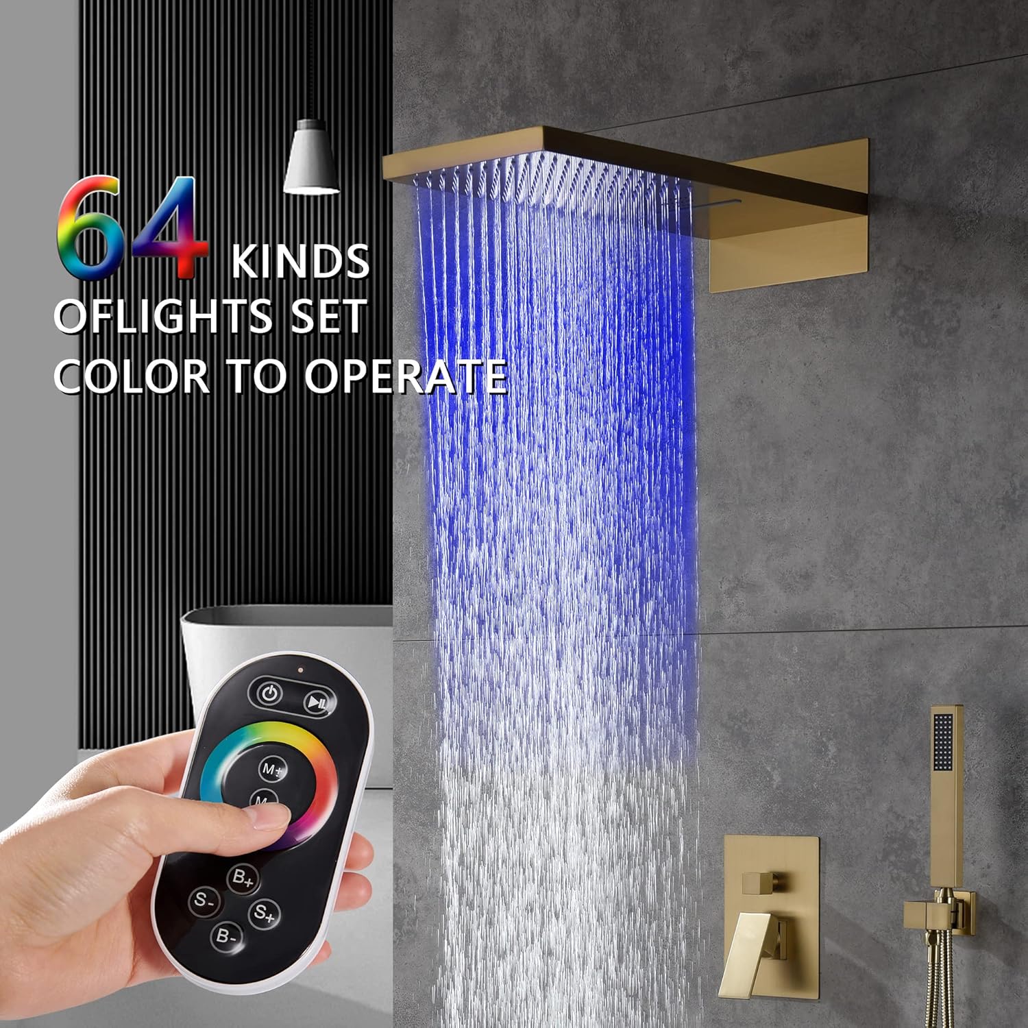 | Included Components | 1 x hand shower + ss shower hose+ brass holder, 1-square knob and 1-rectangle handle mixer, 9” x 22” wall Mounted LED Music Shower head with Single Handle Valve |