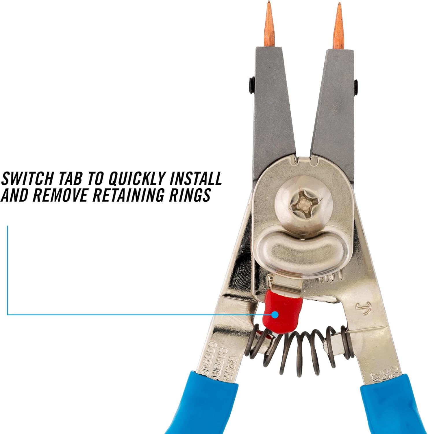 Product Description Channellock - 6.5 Retaining Ring Plier (926) From the Manufacturer The Channellock 926 - 6.25-Inch Retaining Ring Plier - has a capacity 1/8-Inch to 1-Inch external and 1/4-Inch to 1-Inch internal and converts from internal to external rings with a simple switch of the red tab. It includes tips: .023, .036, .047 straight. .036, .047 90° and has a heavy duty return spring. It is heat treated for longer life. Sealed air pocket CHANNELLOCK BLUE comfort grips.