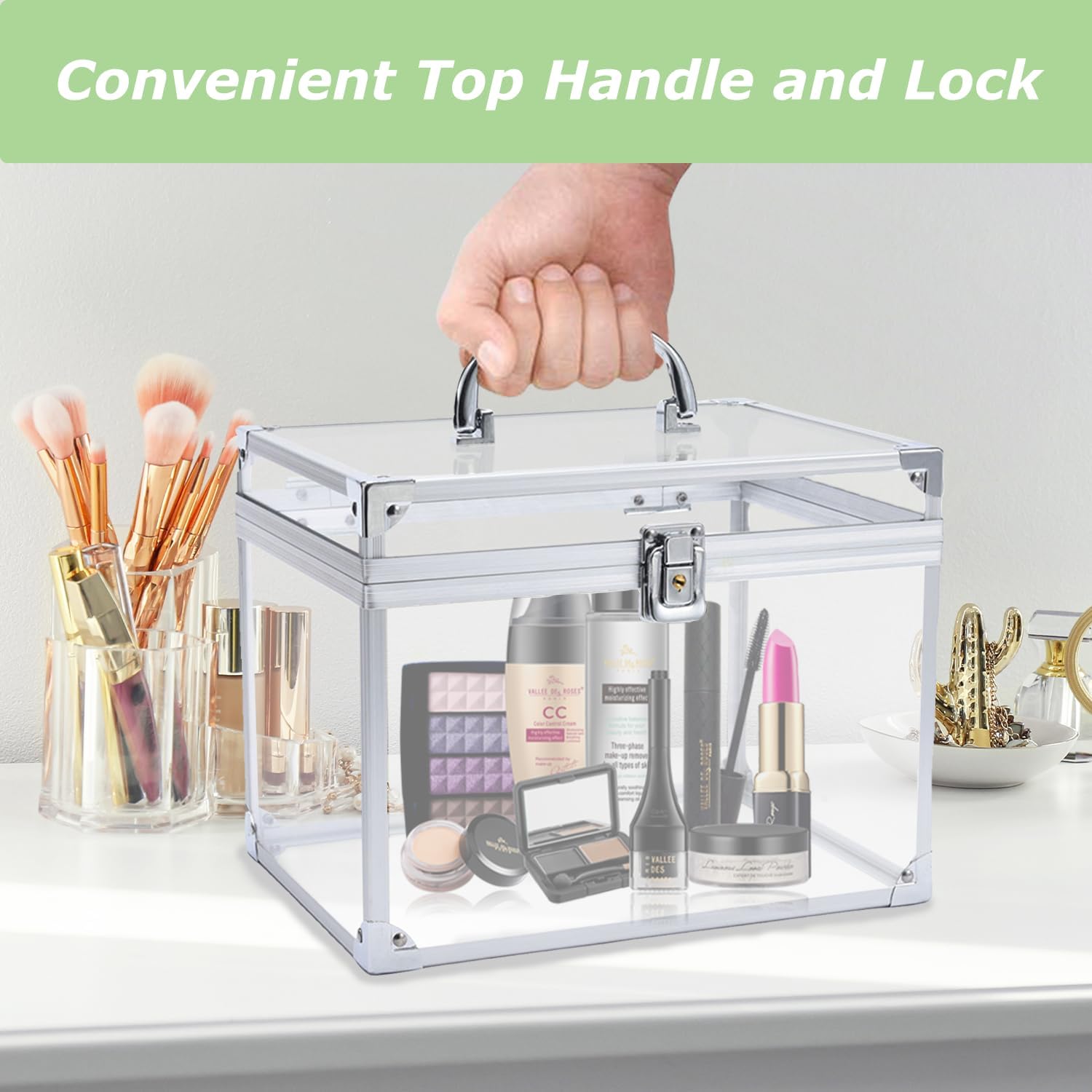 Bullet Points:Spacious Storage: Measuring 10.2x7.5x7.9 inches, this cosmetic case offers ample room to organize and store your makeup essentials.Easy Transport: Featuring a sturdy handle, it’s perfect for travel, providing convenient and hassle-free transportation for makeup enthusiasts and professionals.Secure Closure: The reliable latch ensures your valuables stay safe and secure, maintaining the integrity of your makeup collection.Transparent Design: The clear, see-through design allows for easy identification of contents, saving you time and effort in your beauty routine.Ideal Gift: This cosmetic case is a perfect gift for friends or family who love makeup, offering both practicality and elegance.Organize your cosmetics with ease using our Large Clear Cosmetic Case. With its generous size, this case provides ample storage for all your makeup essentials, whether you’re a professional makeup artist or just a beauty enthusiast. The transparent design not only makes it easy to locate exactly what you need but also adds a touch of modern elegance to your beauty collection.Please note that cosmetics are not included. Due to manual measurement, slight dimension differences may exist, and there may be slight color variations due to different screen settings. We strive to provide the most accurate representation of the product color in our images.Specification:Product Name: Makeup BoxMaterials: PET+AlloySize: about 26 x 19 x 20cm/10.2x7.5x7.9inNote:1. Cosmetics are not included.2. Slight differences in color may occur due to different screen resolutions.3. Please allow for minor dimension variations due to manual measurement.