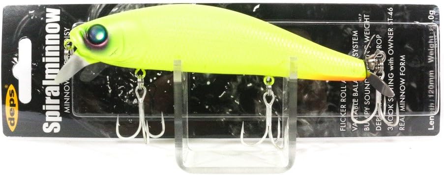 DEPS SPIRAL MINNOW / Spiral Minnow; Size: 4.7 inches (120 mm); Weight: 0.9 oz (25 g); Spiral Minnow is a wakebait that can quickly search directly below the surface of the water as a Minnow form prop noise that leads to bites due to food properties, even bass that do not matter the format. The fluttering action of the roll subject, and the depth prop that emits a metal sound while increasing the splash, brings a complex and powerful pull, making it appealing as if it is a flock of baitfish. In addition, the 3-hook system greatly reduces misbite and has a hook performance that ensures that the bass is attacked. The spiral minnow search performance and reliable bite-induction will quickly fill the bus distance even in sudden changes or first field and cut the break to lead to big bass.