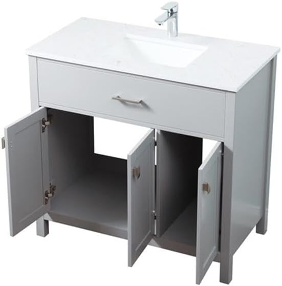 Elevate your bathroom aesthetic with our precision-crafted 36-inch vanity, featuring a chic straight edge cut and an engineered marble top that infuses a dash of modern elegance into your space. Designed for seamless access and ample storage, the vanity showcases two functional cabinets with soft close doors, paired with a faux top drawer. The sophisticated undermount porcelain sink seamlessly merges style with practicality, while the inclusion of stylish hardware adds a personalized touch and ensures convenient access to storage. Boasting a lower open shelf for additional storage, this vanity seamlessly blends functionality with style, providing a practical area for decor or essentials. Complete with a single pre-drilled hole for seamless faucet installation, our versatile vanity allows you to effortlessly personalize your bathroom, adding a final touch of elegance to your unique space. Redefine your bathroom experience with this stylish and functional addition.Features:- Material: Solid wood, MDF, aluminum alloy, engineered marble, porcelain- Finish: Gray, chrome, white- Showcasing a chic straight edge cut and crafted with precision, our vanity boasts an engineered marble top that adds a dash of modern elegance to your space.- Featuring two functional cabinets paired with a faux top drawer, our design offers ample storage space with seamless and stylish access through two soft-close doors.- Complete with a sophisticated undermount porcelain sink, our vanity seamlessly merges style and practicality for an elevated bathroom experience.- Designed with stylish hardware, our vanity is adorned with three knobs and one decorative pull, adding a personalized touch to its design while ensuring convenient access to storage.- Boasting a lower open shelf for additional storage, this vanity offers a practical area to display decor or stow away essentials, seamlessly blending functionality with a touch of style for your bathroom.- Crafted with your convenience in mind, our vanity features a cut-out back panel, ensuring a hassle-free plumbing installation with easy access and efficient functionality.- Requiring no assembly, our freestanding vanity offers a hassle-free solution, instantly bringing sophistication to your space with effortless ease.- Featuring a single pre-drilled hole for a seamless installation, our versatile vanity allows you to effortlessly personalize your bathroom with the perfect faucet, adding a touch of elegance to your space.- Can use in bathroom- Hand painted- UPC and cUPC certified- Sink mounting type: Undermount- Free-standing vanity mounting type- Faucet hole spacing: 1 hole- 1 faucet hole- Furniture/ vanity have a finished back- No ball bearing glides- Door handle designs: Bar pulls- Number of installation holes per handle: 2- Soft close doors- Number of cabinets: 2- Leg design: Straight- Tip over restraint strap: NO- Sink shape: RectangleSpecifications:- Product Dimensions: 34"H x 36"W x 19"D- Product Weight: 104 lbs- Product Dimensions: (Counter top) 0.71"H x 19"W x 36"D- Product Weight: (Countertop) 35.4 lbs- Product Dimensions: (Vanity Sink) 8.25"H x 15.35"W x 10.24"D- Product Weight: (Vanity Sink) 13.23 lbs- Product Dimensions: (Sink drain hole) 1.77"- Product Dimensions: (Sink drain distance from side edge of countertop) 18"- Product Dimensions: (Faucet Hole) 1.38"- Product Dimensions: (Faucet hole distance to top edge of countertop) 2.09"- Product Dimensions: (Faucet hole distance to side edge of countertop) 18"- Product Dimensions: (Distance Between Shelf And Cabinet/Sink) 19.09"- Number of Doors: 3- Product Dimensions: (Door Thickness) 0.59"- Product Dimensions: (Door Handle) 1.02, 1.07"H x 0.31, 1.14"W x 6.22, 1.89"D- Product Dimensions: (Cabinet Interior) 27.83"H x 21.48, 11"W x 17.24"D- Product Dimensions: (Handle Door Center to Center) 0.7"; (Handle Drawer Center to Center) 3.8"- Leg Dimensions: 33.07"H x 1.57"W x 1.57"D- Certifications and Listings: TSCA VI- Warranty: 1 year limited