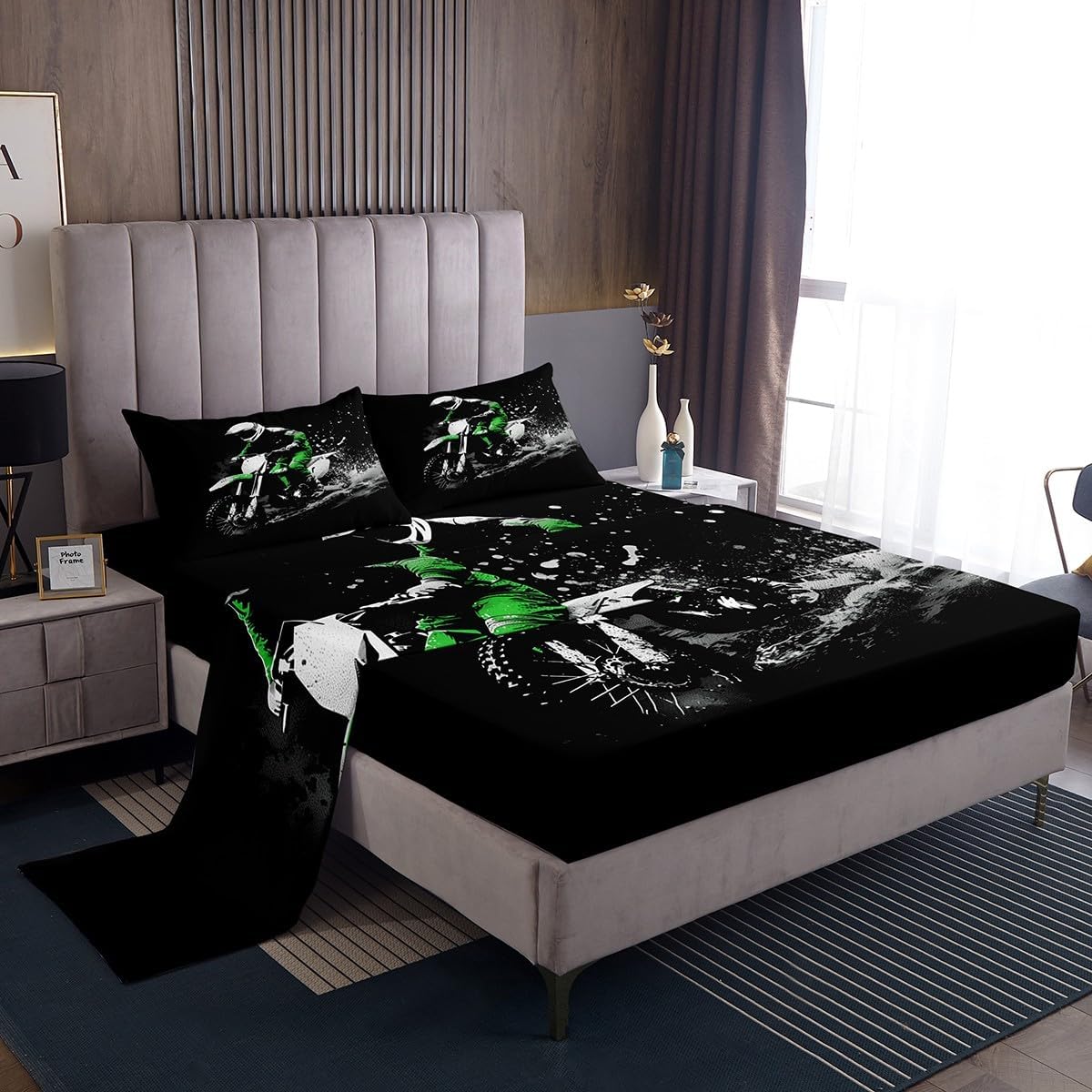 Feelyou Motocross Bed Sheets Set Twin Size Red Splatter Elements Bed Set Dirt Bike Deep Pocket Fitted Sheet Motorbike Breathable Soft Lightweight Microfiber Dynamic Racing Scene
