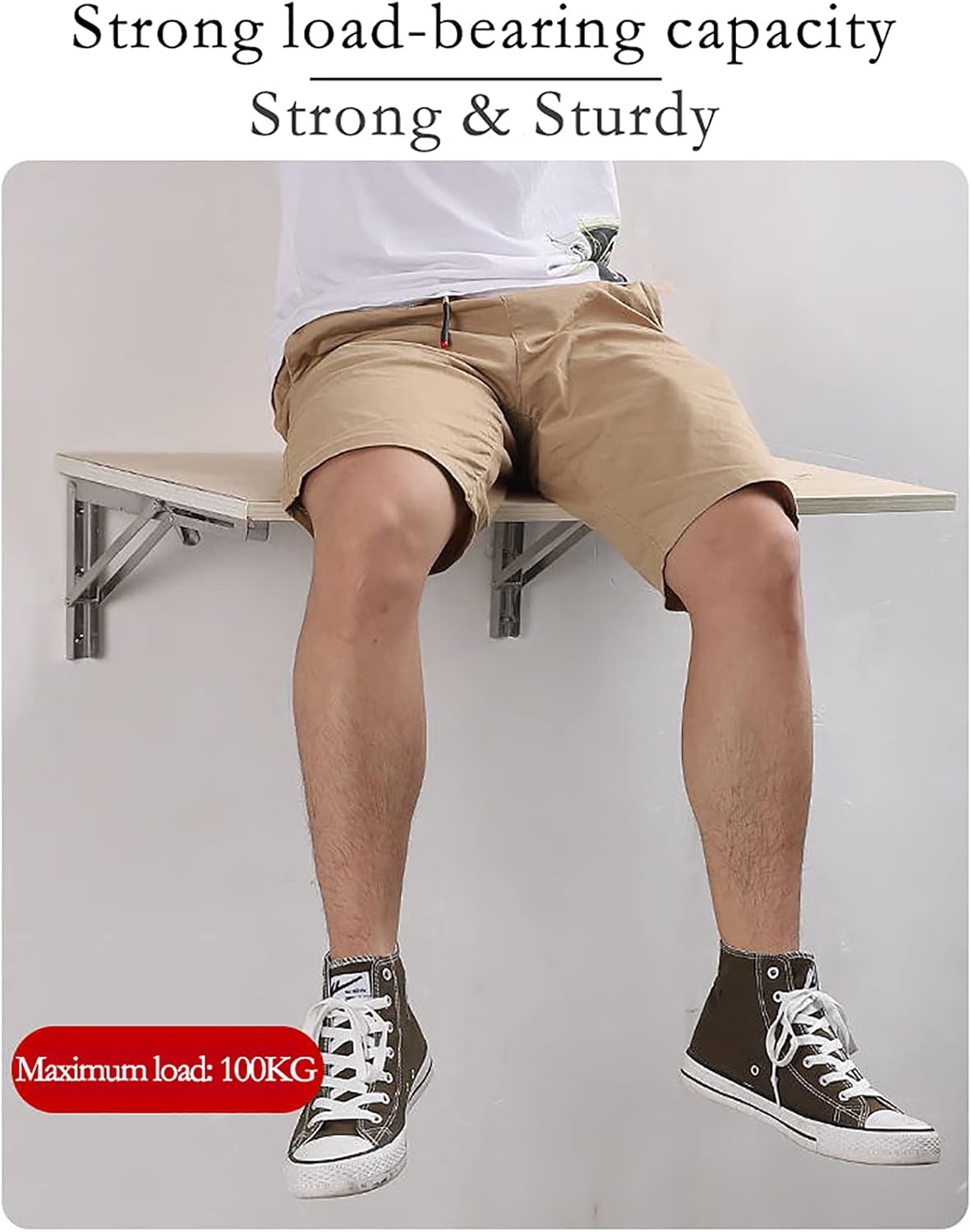 • BRACKET SIZE - Supports max. load 154 lbs/75kg bearing capacity - triangle shape is the sturdiest construction in wall brackets currently. Enough to be used as bookshelf, kitchen shelf, exhibition stand, garden shelf, external wall brackets etc. Heavy duty stainless steel folding shelf brackets are perfect for your garage style.