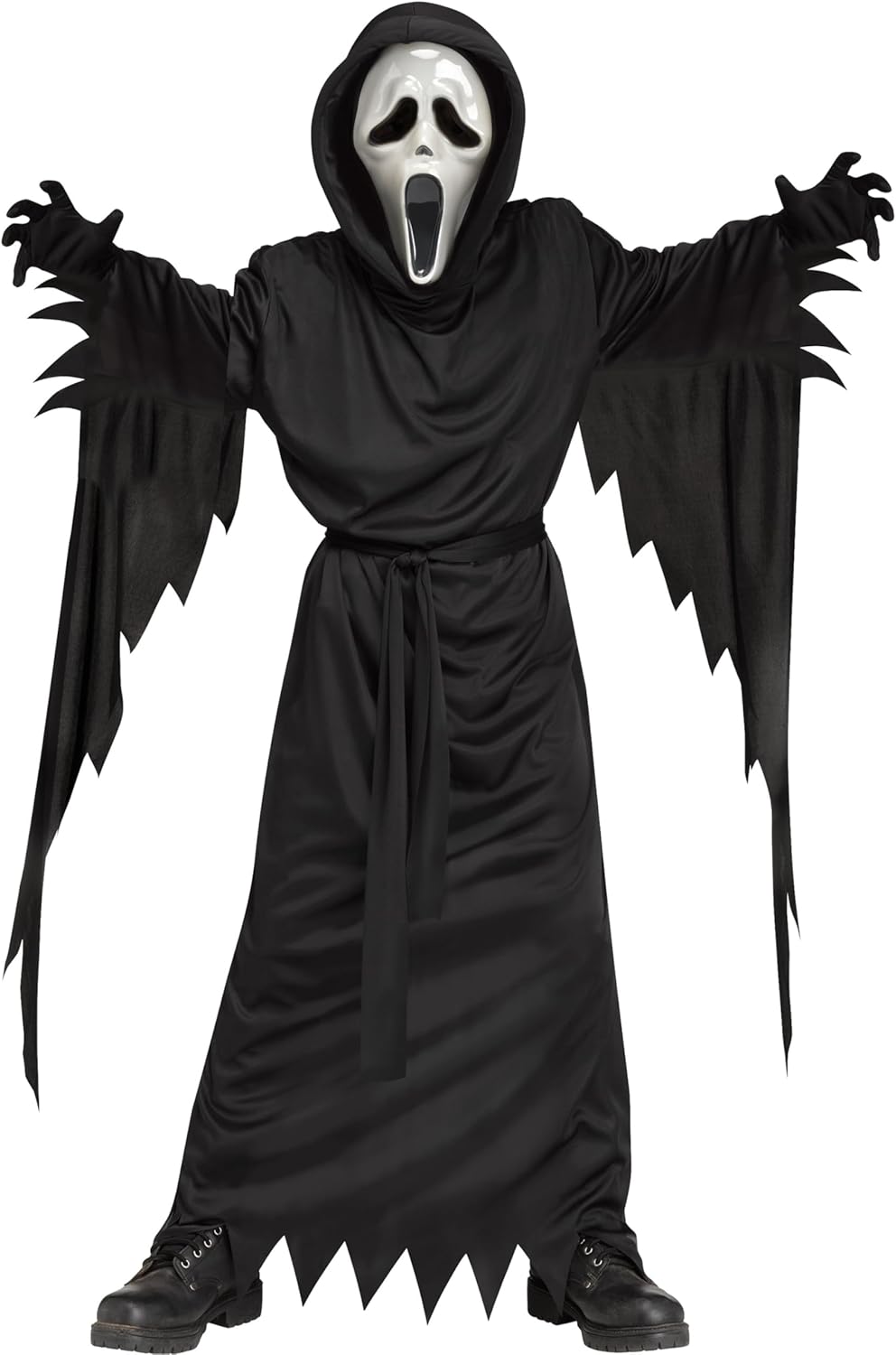 The Fun World Bleeding Ghostface® Child Costume delivers an extra layer of fright with its unique, blood-pumping effect. This spooky set includes a black, jagged-edged robe and a terrifying ghost face mask. With the simple squeeze of a hand pump, blood flows through the mask, creating a dramatic and gory look that will stand out at any Halloween event or costume party. Comfortable and easy to wear, this costume offers a chilling visual experience, perfect for kids who want to add some interactive fun to their spooky ensemble.