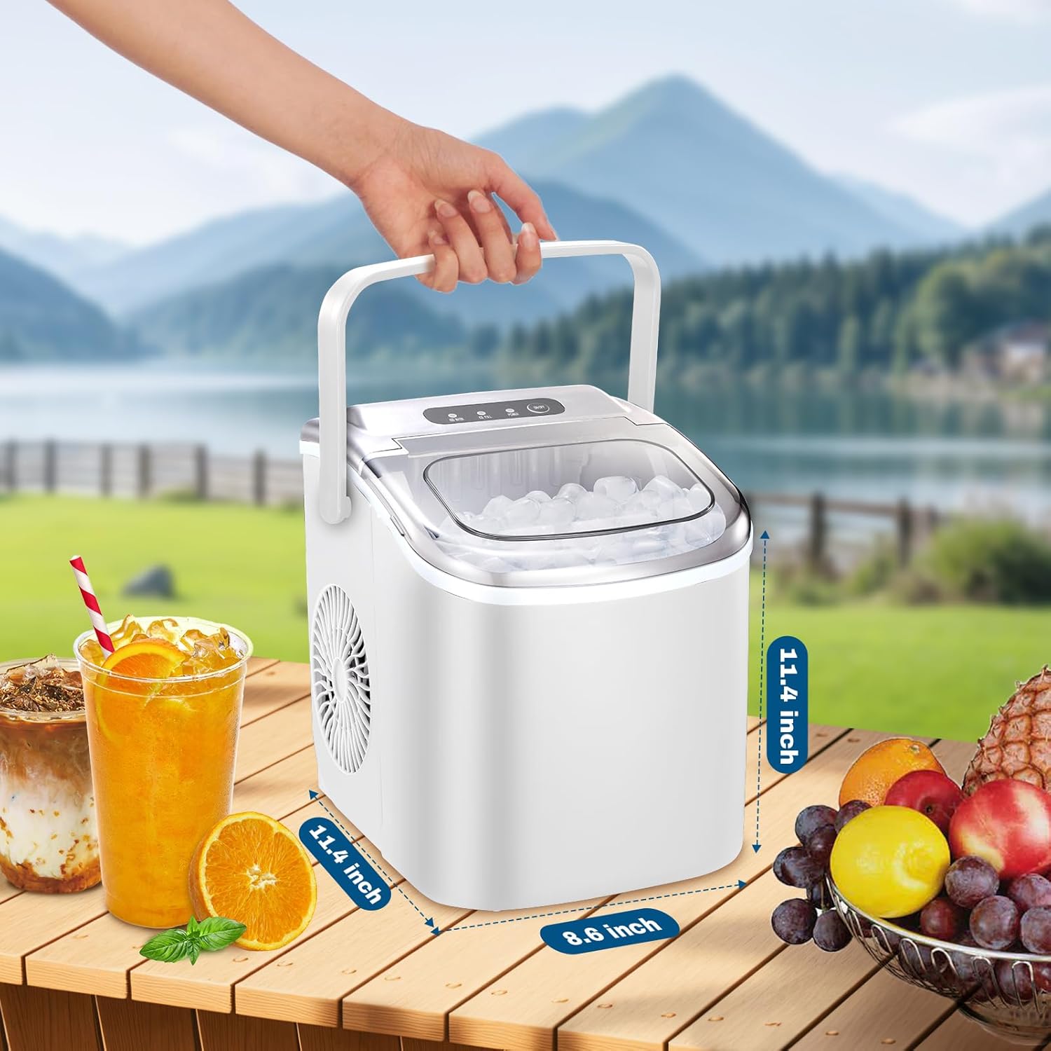 The Bullet Ice Maker is the perfect upgrade for any kitchen, providing a steady supply of ice for juices, coffee, and other beverages. With quiet operation and a sleek, compact design, you can use it anywhere. Whether it's for personal daily use or preparing iced beverages for friends who are visiting your home, our ice makers countertop is a great choice! Ice Machine Maker Countertop Features: 1, Enough Ice Production for Daily Use: the small ice maker can make 9 ice cubes in 6 minutes, and can produce 26 pounds of ice in 24 hours, which can fully meet your daily ice needs 2, Auto-Cleaning: just long press the on/off button for 5 seconds, the ice cube maker will start auto-cleaning to provide you with a clean ice making experience 3, Convenient and Compact Design: the portable ice maker comes with a carrying handle, you can take it to wherever you want at any time, very convenient to move around 4, One-Button Operation: just add water into the ice maker and press the on/off button, the ice maker will start to operate. 5, Transparent Window: you can directly observe the ice making process and check the ice volume, no need to open the lid frequently. Ice Maker Specifications: Size: 8.66''D x 11.3''W x 11.42''H Net Weight: 13.53 lb Enjoy a cooler experience every day with our portable ice maker countertop!