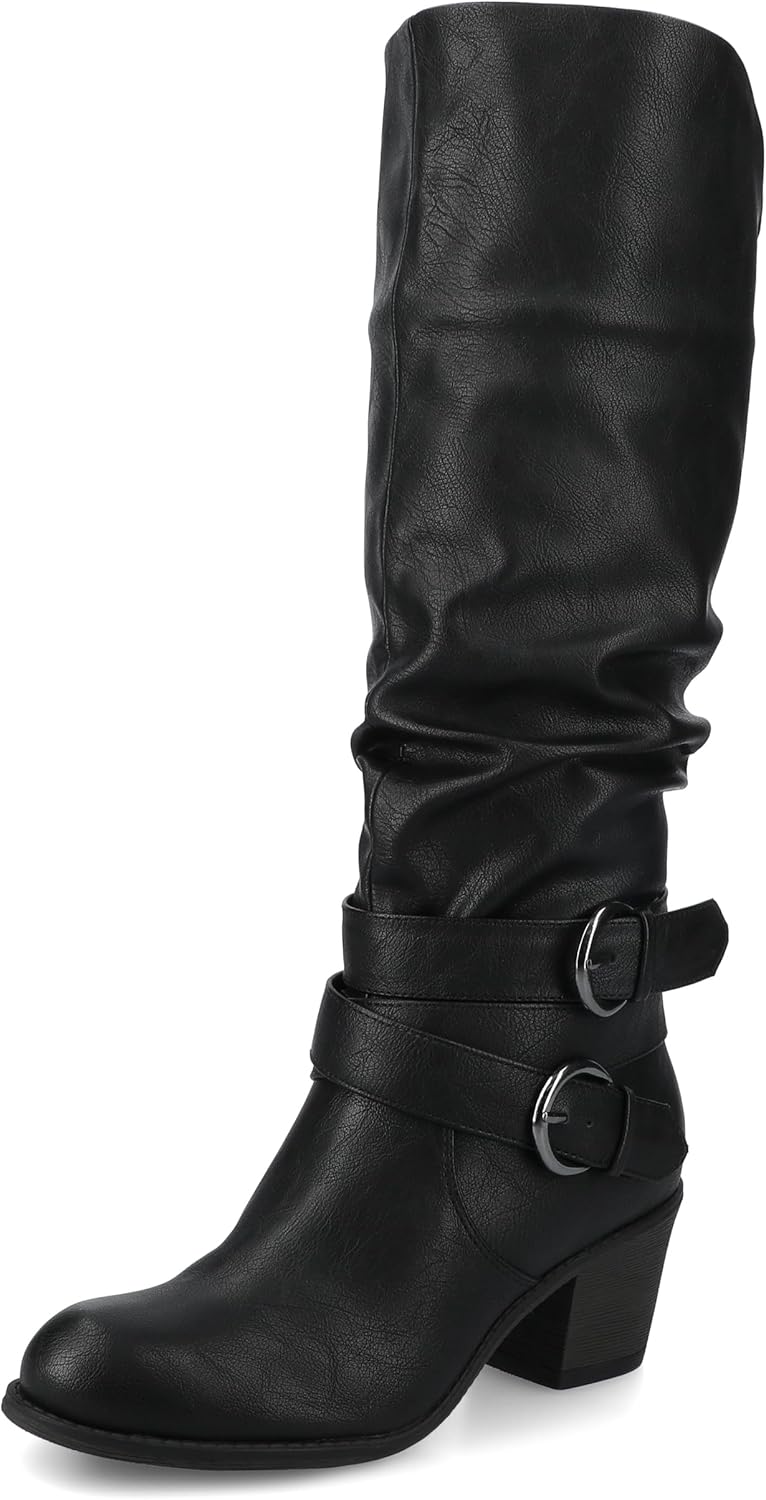 Slide into effortless cool with the Late knee-high boot by Journee. The softly slouched 14-inch shaft in supple faux leather gives laid-back, lived-in character, while a round toe and walk-friendly 2¼-inch stacked heel keep the vibe casual yet polished. A hidden ½-inch platform adds subtle lift, and the pull-on design means no fiddly zips—just grab and go. Inside, a fabric lining and padded footbed cushion every stride, and a durable rubber outsole supplies sure footing. Available in versatile Black, rich Dark Brown, and on-trend Taupe, Late is the throw-on-and-go boot that instantly elevates jeans, leggings, or sweater dresses.