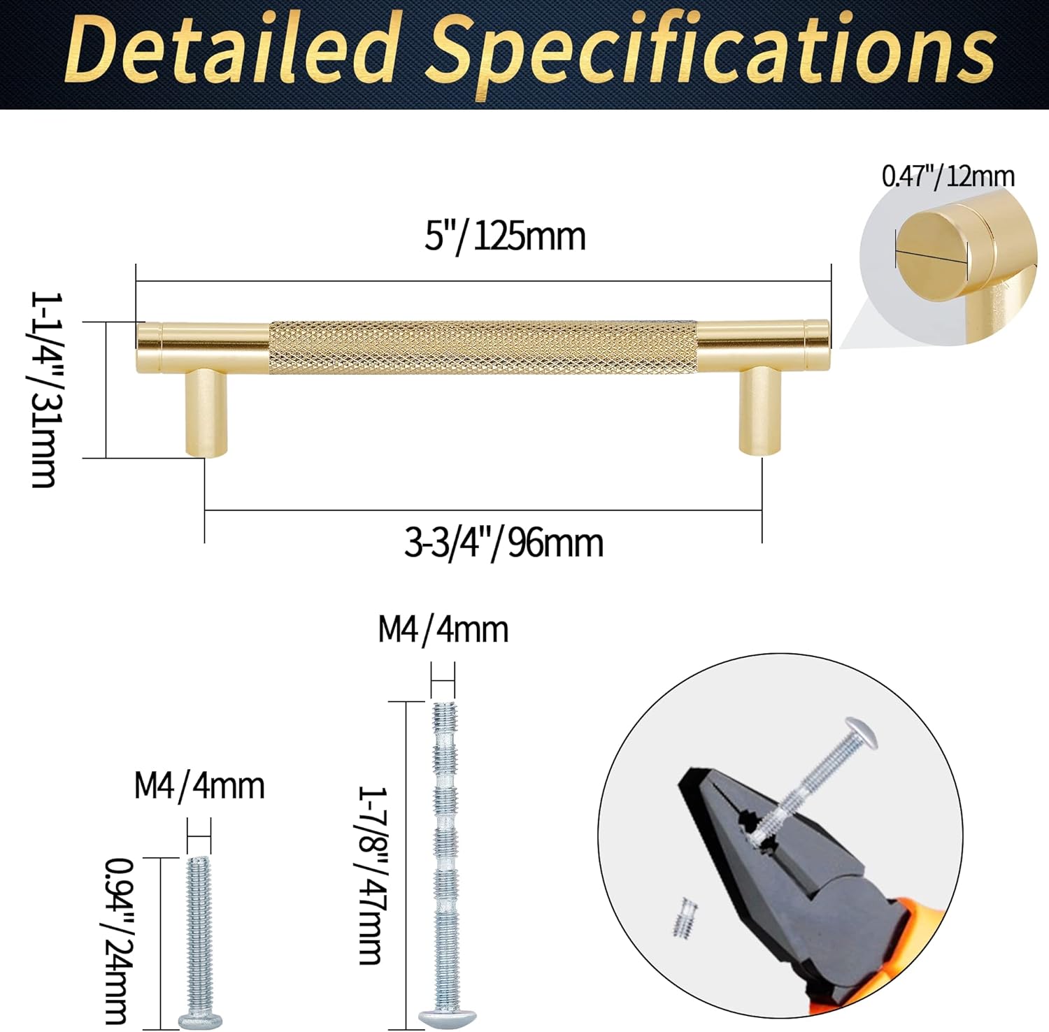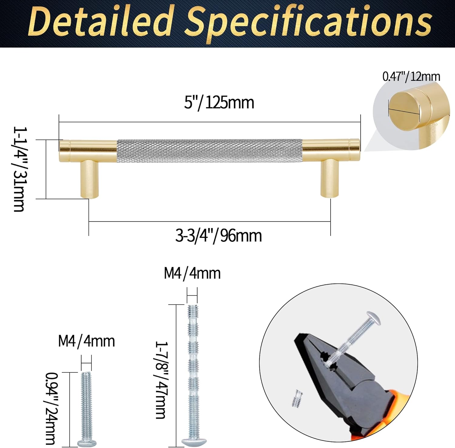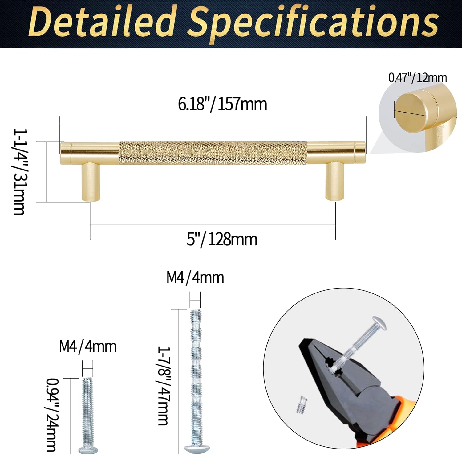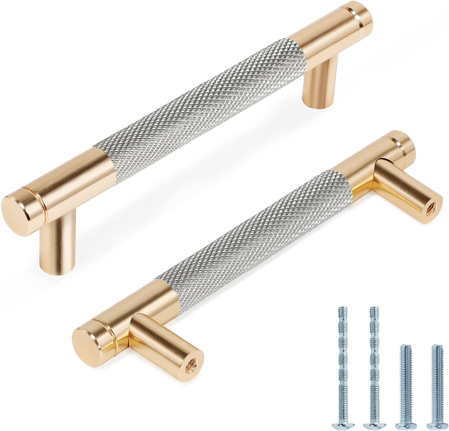 Features: 1.Our knurled drawer pulls are individually bagged, each with two different types of mounting screws for convenient installation. 2.The colour-blocking and knurled texture design of the drawer pulls deliver a gorgeous and fashionable visual impact. 3.You can have a luxurious look to your house in daily life within your adequate budget. 4.Constructed of high-hardness solid aluminium alloy, our knurled drawer handles is resistant to corrosion without rusting. 5.The diamond pattern surface has been treated with elaborate forging and polishing that provide a comfortable grip without slipping. 6.Our knurled cabinet handles are compatible with Boho, European, Minimalist, Modern or Mid-century furniture. 7.These premium hardware pulls are an affordable option if you crave an upgrade or replacement for pulls in your kitchen cabinets, cupboards, wardrobe, bathroom vanity, or dresser drawers. Specification: Color: Black & Gold Material: Aluminium Alloy Handle Hole Centers: 5" / 128mm Regular Screws : M4 * 1" / 25mm Breakaway Truss Head Screws: M4 * 1-3/4" / 45mm Package Included: 25 x Knurled Cabinet Pulls 50 x Regular Screws 50 x Breakaway Truss Head Screws Warm Tips: 1.We offer screws in two different lengths for thicknesses: 13 - 40mm / 1/2" - 1-9/16" 2.As the size is measured by hand, please allow 1-2mm difference between the actual size and the hand measured size. 3.The pictures of the product are as close to the real thing as possible, but the colors are slightly different due to equipment, lighting and display.