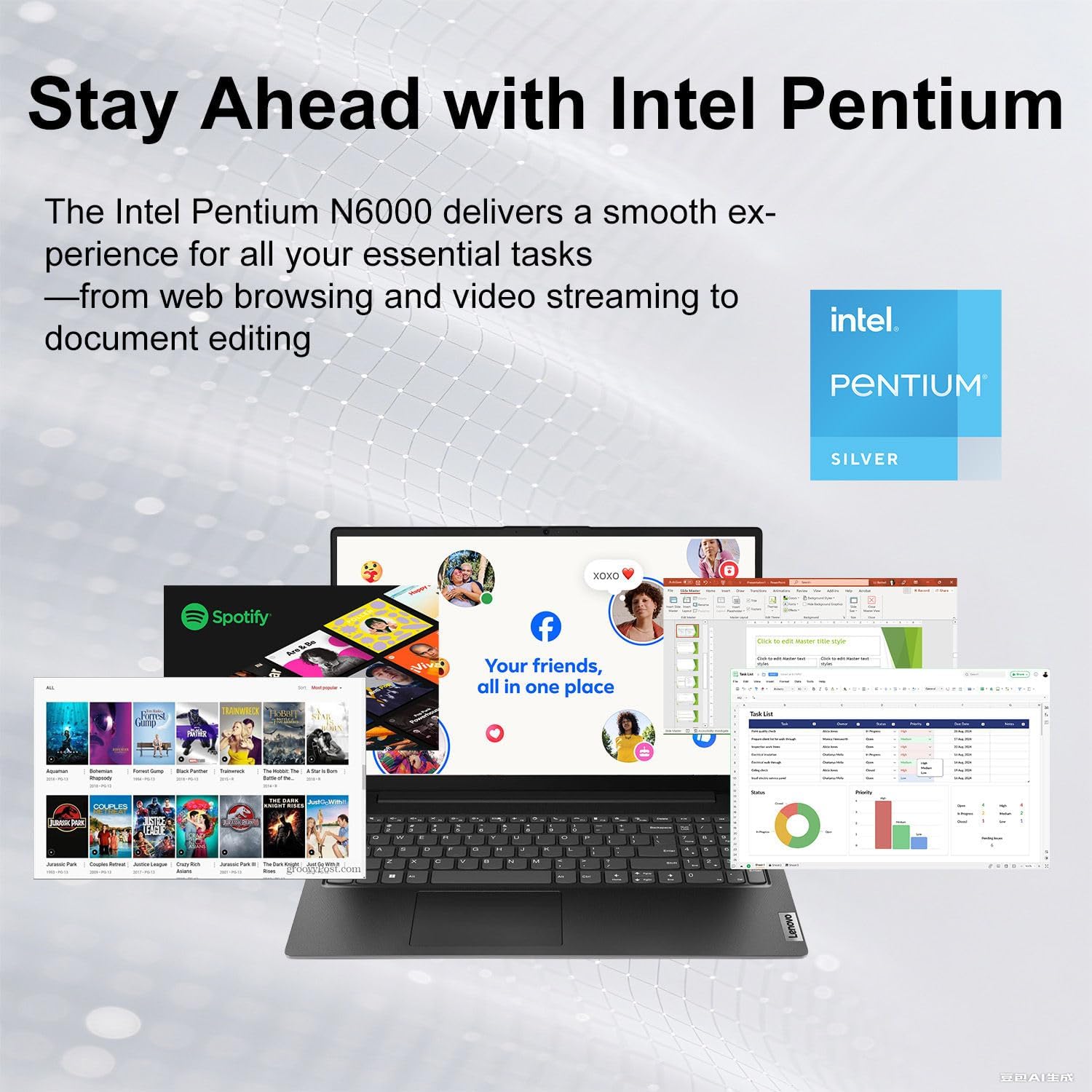 Processor: Intel Pentium N6000 (4 Cores, 4 threads, up to 3.3 GHz) Graphics: Integrated Intel UHD Graphics Operating system: Windows 11 Pro Memory: 16GB DDR4 Hard Drive: 1TB SSD Display: 15.6" FHD, Anti-Glare Connectivity: Wi-Fi 6 and Bluetooth 5.2 Audio: High Definition (HD) Audio, Realtek ALC3287 codec Spreakers: Stereo speakers Keyboard: Full-size, Non-backlit, English with numeric keypad Built-in HD Webcam: HD 720p with Privacy Shutter Ports: 1 x USB 3.2 Gen 1 Type-C 1 x USB 2.0 Type-A 1 x HDMI 1 x Headphone / Microphone Combo Jack 1 x Ethernet (RJ-45) Battery: Up to 11.4 hours Color: Black Dimensions L x W x H (inches): 14.14 x 9.28 x 0.78 Weight: 3.75 lbs