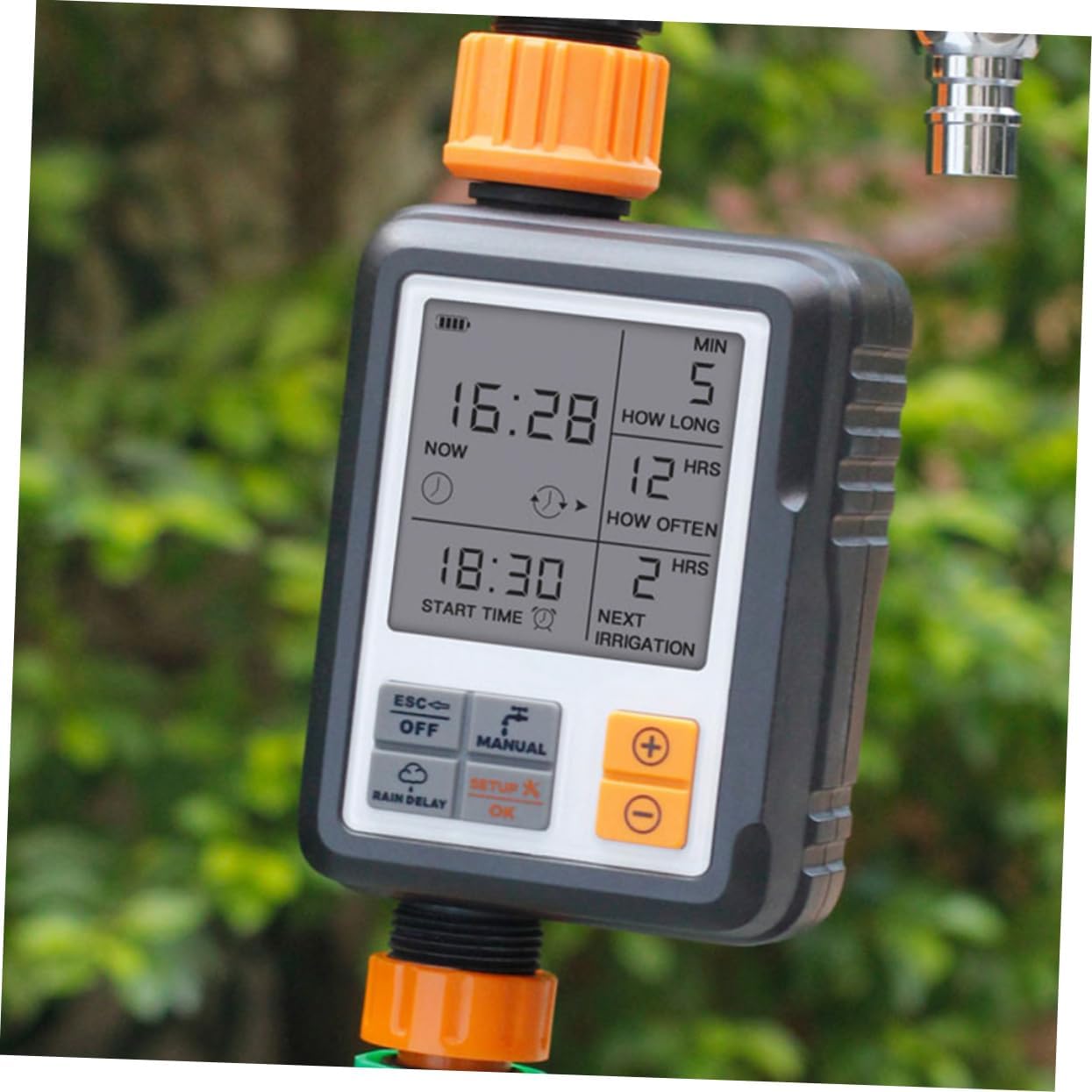 Package Include 1 set x automatic water timer kit Features -Material: Plastic irrigation timer. -Size: About 16.00X5.50X8.00cm/6.29X2.16X3.14in intelligent timed irrigation controller. -Water Inlet: 3/4" internal thread sprinkler controller. -Product Info:Automatic flower waterer -Water Outlet: 3/4" outer thread automatic irrigation timer. -Color:Black automatic water timer - Battery: 2 x AA batteries(Not included) irrigation timer system. - You can water the plants immediately in manual mode without interrupting the watering programmable watering. - Manual rain delay function is also accessible to save water in (The programmed watering time will be delayed by an interval) automatic irrigation controllers. - The watering duration ranges from 1s to 300min, frequency from 1h to 15 day and manual irrigation duration from 1-240min water sprinkler timer. - The watering timer provides a large selection of irrigation duration and frequency to make your watering fully garden water timer. - button operation makes the programming easier and fool-proof without much steps required irrigation timer controller.Goods Informationirrigation timer controller This automatic watering device is made of that is durable for long time use.water sprinkler timer Time setting makes it convenient for you to use.irrigation timer It has , suitable for home gardening, agricultural production, and gardening.automatic water timer You can't miss it