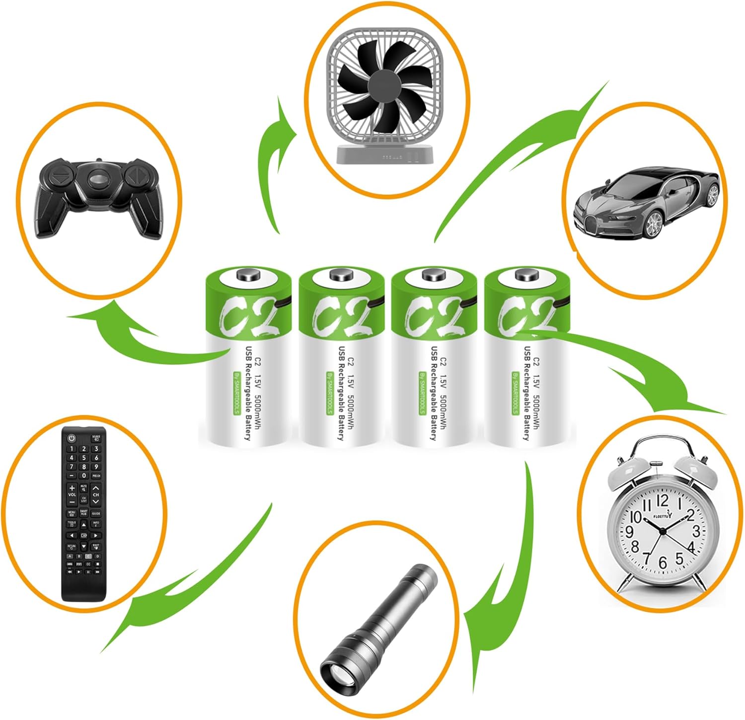 Rechargeable 6-pack of high-capacity C batteries. Boasting an impressive 5000mWh of lithium-ion power, these 1.5V C cell batteries offer long-lasting performance for all your gadgets and devices. Conveniently rechargeable via the included USB Type-C cable charger, you can reduce waste and save money by reusing these batteries over and over again. With their reliable and consistent output, these C batteries are perfect for powering remotes, toys, flashlights, and more. Keep 6 pack Rechargeable C Batteries on hand for seamless power whenever you need it.