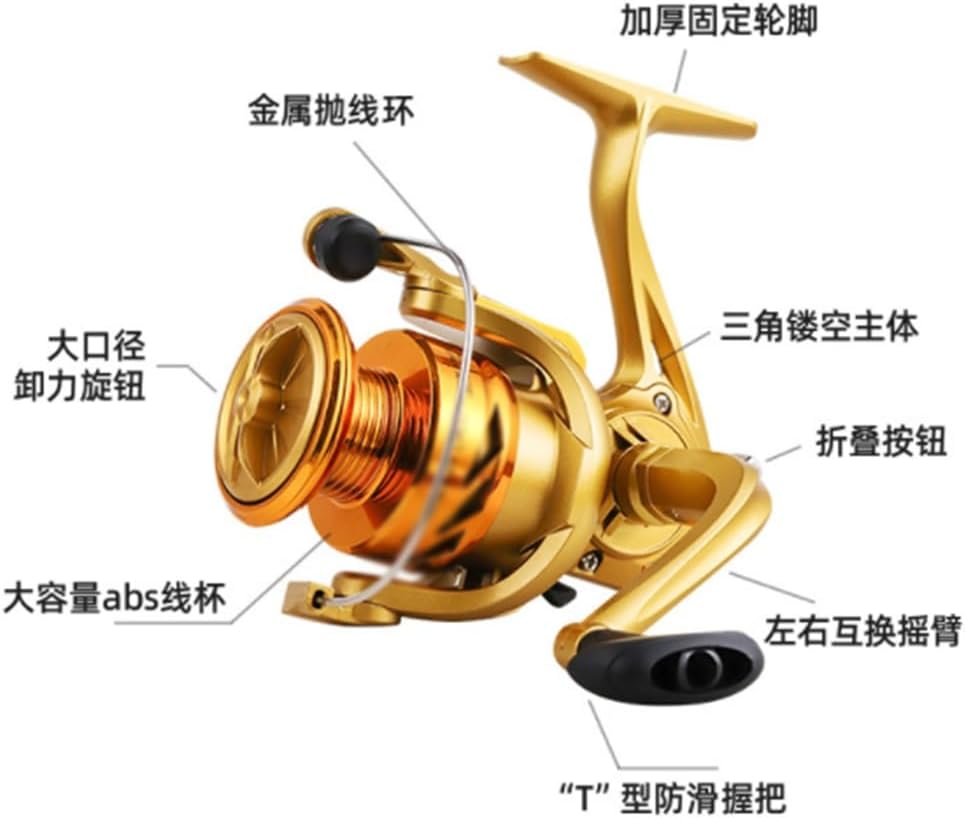 Foldable design, easy to store, interchangeable left and rightT-shaped rubber handle, effortless throwing, comfortable to touchOblique exit line, smooth and smooth without damaging the line, large capacity deep line cup, casting fartherLarge caliber, more convenient for adjusting unloading forceIt's easy to fight against the big fishPackage includes: Fishing wheel *1 (excluding other display items)Notes:1. Colors may vary due to different monitors.2. Due to different manual measurement, please allow a slight size difference.Saltproof 5000 Spinning Reel - Lightweight Aluminum Body for Ocean Fishing, 20LB Drag PowerMagnetic Brake Baitcaster Reel - Low Profile Design for Bass Fishing, Zero Backlash Tech