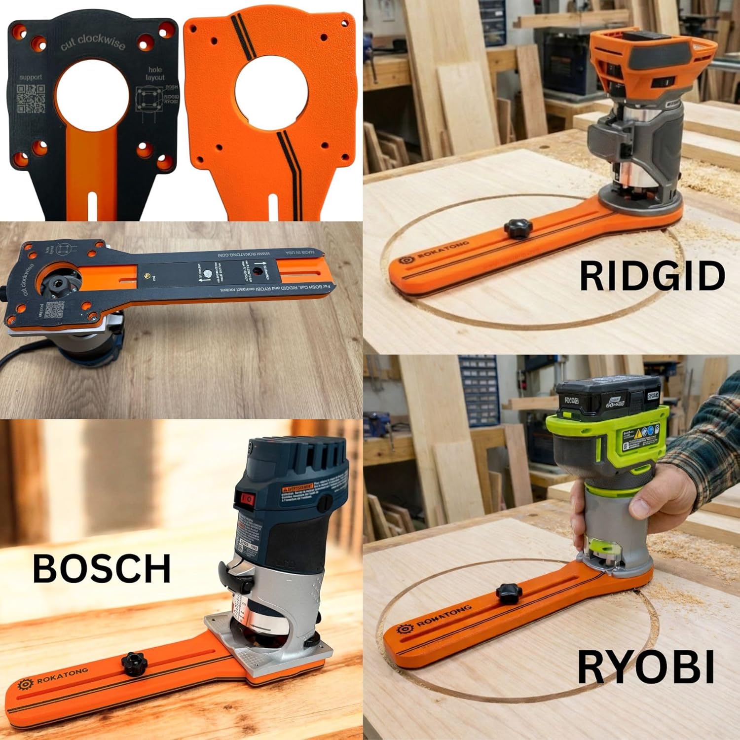 Router circle jig designed specifically for creating perfect circular cutouts with precision and consistency. Engineered for use with BOSCH Colt PR10E/PR20EVS, RIDGID R2401, R24012, R860443B, R860444B, and RYOBI P601, PCL424 Fixed Base Compact Trim Routers, this jig provides a stable and controlled solution for cutting clean, accurate circles in woodworking applications. The adjustable radius system allows precise diameter control, making it easy to produce repeatable results for speaker cutouts, round panels, inserts, and decorative elements. Unlike freehand cutting, this circle cutting jig ensures smooth edges and consistent geometry every time. A reinforced structure improves rigidity and reduces flex, helping maintain stability during operation. The fixed pivot point provides accurate rotation, allowing the router to follow a controlled circular path without deviation. Compatible with compact trim routers that share the same mounting hole pattern, this woodworking circle jig is easy to install and requires minimal setup. Designed and manufactured in the USA using carbon-fiber reinforced polymer components and high-quality 304 stainless steel hardware, it provides reliable performance and long-term durability in workshop use. Whether you are a beginner or experienced woodworker, it provides a dependable solution for achieving precise circular cuts with a compact trim router. Ideal for projects that require accuracy and repeatability, this router circle jig improves cutting precision, efficiency, and overall results in any woodworking workshop.