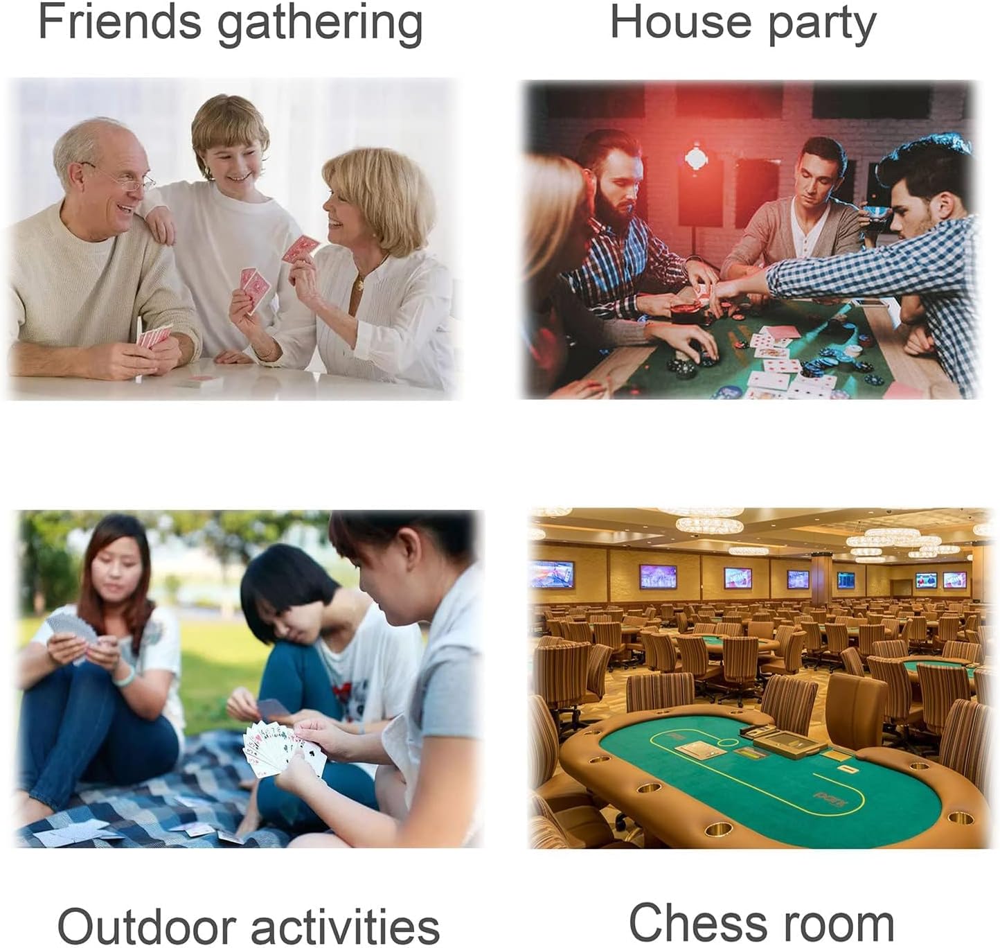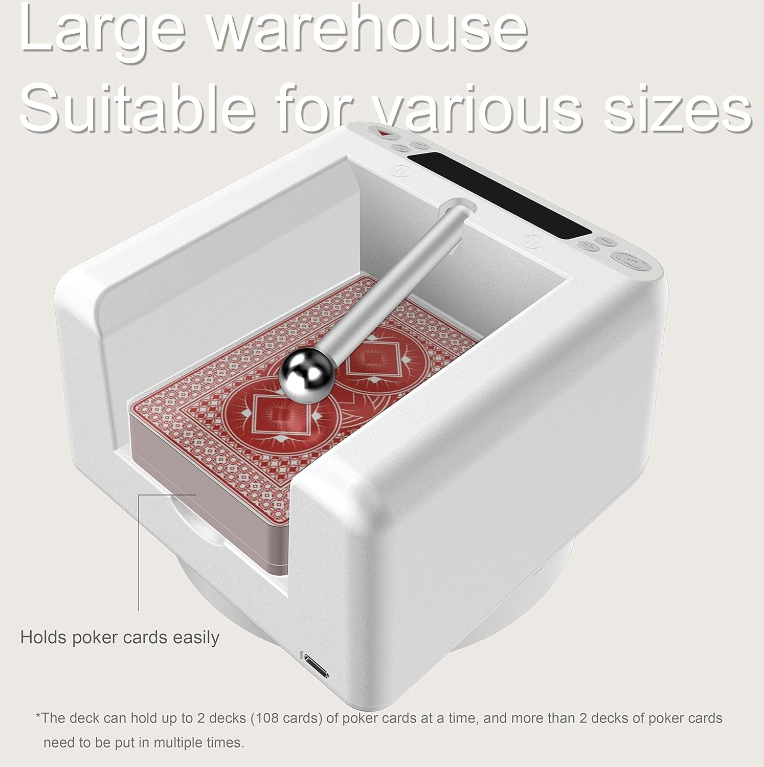 Suitable playing card size: 22.44x34.25 inches 24.8x34.65 inches 23.62x37.8 inches Product size: 4.72x4.92x3.35 inches Maximum number of players: 8 Maximum number of cards dealt: 792 This card dealer works with card games such as bridge and playing cards, Texas Hold'em Poker, and UNO game cards. Incredible for all ages, get shuffling to speed up gaming time and focus on the game instead of fiddling.