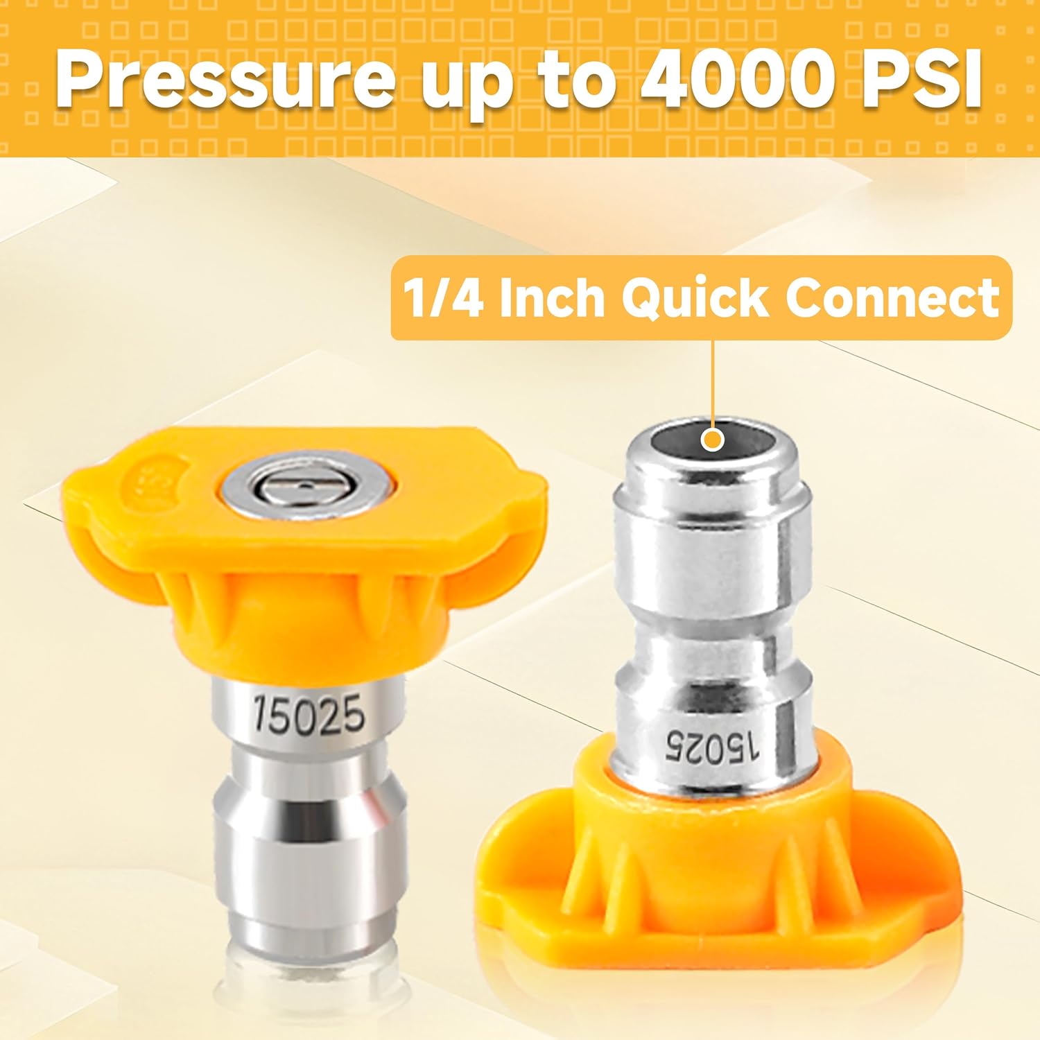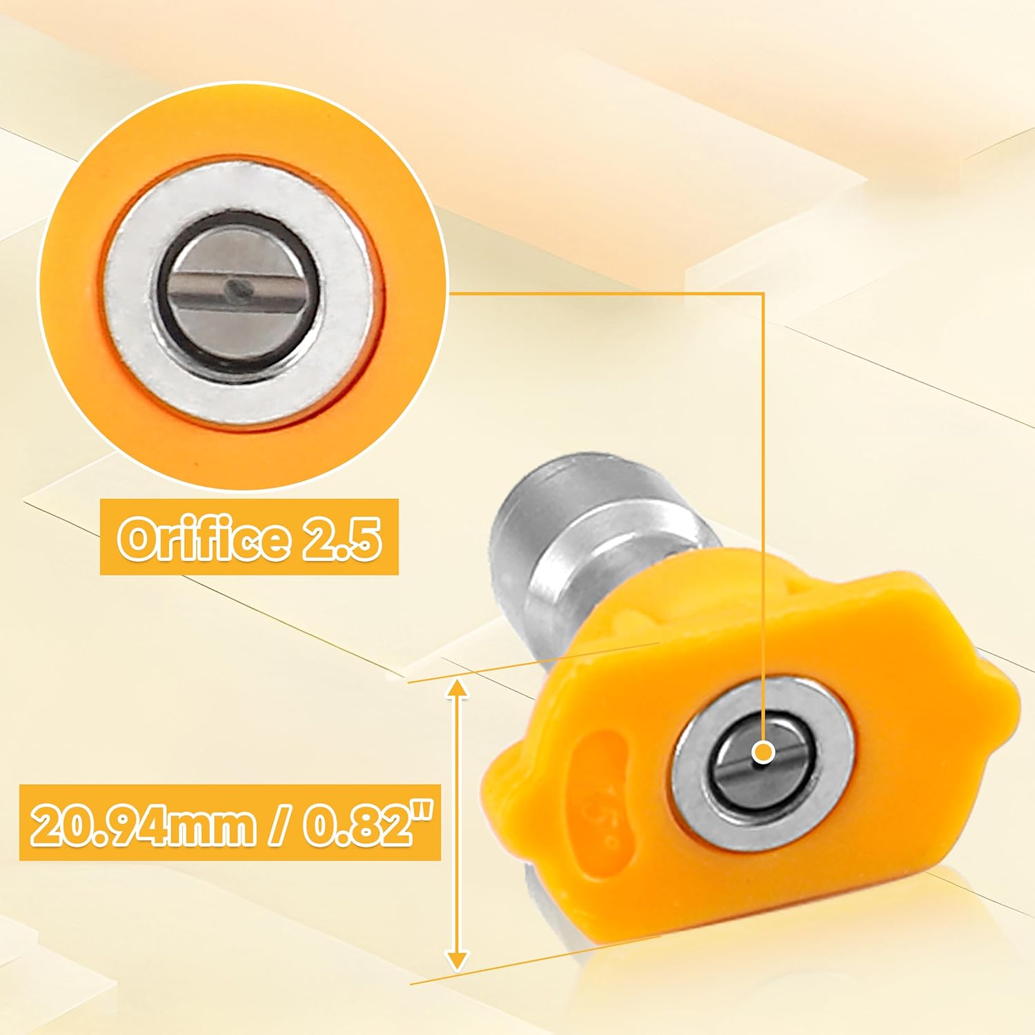 Powerful Performance: These pressure washer nozzles have a 2.5 orifice size and support a maximum working pressure of 4000 PSI, making them compatible with most pressure washersEasy Installation: Equipped with a 1/4โ standard quick connector, these power washer tips easily attach to pressure washer guns or wands. The quick-connect system also ensures a secure, leak-free experienceSuperior Quality: Made from premium stainless steel, these pressure washer nozzle tips are rustproof, corrosion-resistant, and highly durable. The nozzle holder is crafted from sturdy plastic, while the clip is made from Aluminum for added longevity