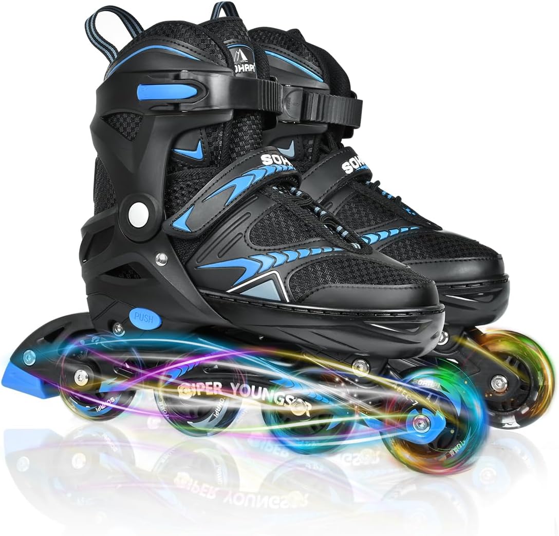 Inline skate surfaces are treated to prevent high strength collision and use shock absorbing material to prevent vibration and provide stability. Ensures safety and comfort. The four rows of skate construction uses ABEC-7 bearings that are the highest accuracy in the practical range, providing high safety and a smooth experience. It has excellent silence as well as good in-line skates, sturdy and durable, 220.5 lbs (100 kg), less friction, durable and can be used for a long time. Enjoy a light and comfortable wear. Even if you practice for a long time, you won't be burden on your ankles.
