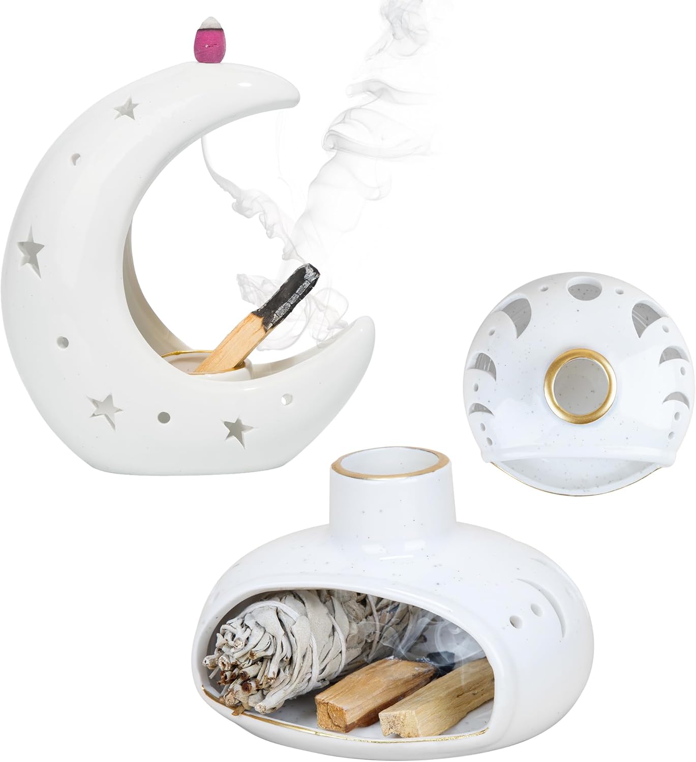 ZenBless Moon Versatile Ceramic Backflow Incense Holder and Burner Waterfall,for Burning Sage, Palo Santo, Backflow Cone and Candle,Aromatherapy Ornament Home Room Decor,The Ideal Present (White) ZenBless 3 in 1 Incense Holder for Palo Santo Sticks Sage Incense, Handcrafted Ceramic Incense Burner Holder Ash Catcher with Chimney, Smudge Bowl for Yoga Meditation Room Home Decor